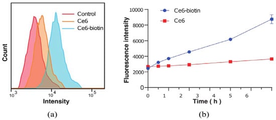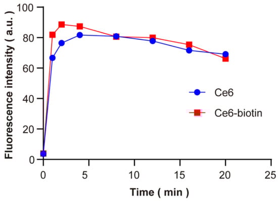 The singlet-oxygen-generating efficiency of Ce6-biotin was measured by the Singlet Oxygen Sensor Green (SOSG) assay. Upon the presence of 1O2, the intrinsic fluorescence of SOSG in PBS is restored, resulting in increased fluorescence with laser irradiation time. As shown in Figure 3, Ce6-biotin was an efficient singlet-oxygen generator, and the efficiency was similar to Ce6. It shows that the introduction of biotin will not affect the ability of Ce6 to produce singlet oxygen. The PDT efficiency of PSs is highly dependent on their singlet-oxygen generation abilities [28,29]. As shown in Table 1, the 1O2 quantum yield of Ce6-biotin (ΦΔ = 0.81) is slightly higher than that of Ce6 (ΦΔ = 0.75), which might be attributed to the large conjugation of the porphyrinic system [10,30]. All these results clearly indicate the singlet-oxygen generation ability of Ce6-biotin.
