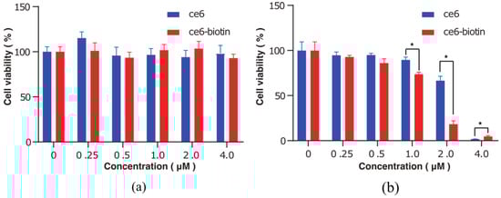In order to measure the therapeutic efficacy and dark cytotoxicity of Ce6 and Ce6-biotin, the 3-(4,5-dimethylthiazol-2-yl)-2,5-diphe-yltetrazolium bromide (MTT) assay was used to determine the viability of the cells treated with the two PSs. The cells treated at zero concentration were set as control groups. Without irradiation, Ce6 and Ce6-biotin showed minimal cytotoxicity to HeLa cells at concentrations between 0.25 and 4 μM (Figure 6a). After irradiation, both Ce6 and Ce6-biotin exhibited concentration-dependent cytotoxicity. The assays showed the viability of HeLa cells decreased from 100 ± 9.57% of the blank control to 1.83 ± 0.08% (Ce6) and 4.72 ± 1.03% (Ce6-biotin) after laser irradiation, as the Ce6 and Ce6-biotin concentration increased from 0.25 to 4.0 µM (Figure 6b). It is noted that at concentrations from 1.0 μM to 2.0 μM, the therapeutic efficacy of Ce6-biotin is significantly higher than that of Ce6 at the same concentration. At concentrations of 4.0 μM, the therapeutic efficacy of Ce6 is significantly higher than that of Ce6-biotin. This is in line with the observed higher uptake of Ce6-biotin than Ce6 in HeLa cells. The calculated IC 50 of Ce6 is 2.31 μM—higher than that of Ce6-biotin (1.28 μM). Furthermore, the cytotoxicity of Ce6-biotin was tested in HeLa (BR+) and B16 (BR−) cells both with and without irradiation. As shown in Figure 7, Ce6-biotin exhibited higher cytotoxicity to HeLa cell than to B16 cells after treatment with the same light dose (20 J·cm−2) and Ce6-biotin concentration (2.0 µM). These results indicate that the Ce6-biotin can enhance the therapeutic effect on BR-positive cancer cells without increasing dark cytotoxicity.
