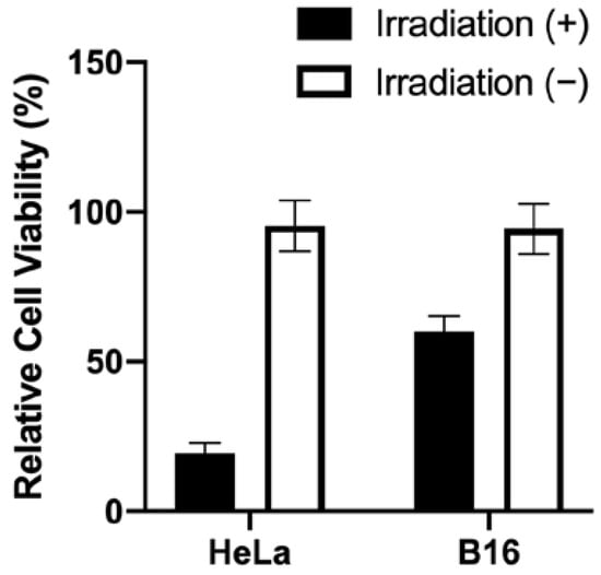 Cytotoxicity against HeLa (BR+) and B16 (BR−) cells with and without irradiation (20 J·cm−2) after incubation with 2.0 µM Ce6-biotin for 24 h.