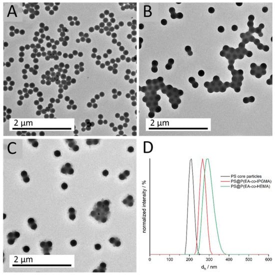 h, for the CIS particle synthesis, starting from 203.2 ± 7.8 nm for the cross-linked PS core particles to 268.3 ± 10.9 nm (PS@P(EA-