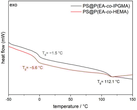 Figure 3 it can be concluded that two glass transition temperatures were obtained for each CIS-particle batch, which is in good agreement with expectations from the synthesis protocols. In this regard, the cross-linked PS cores feature a glass transition at 112.1 °C since the cross-linking increase the corresponding T