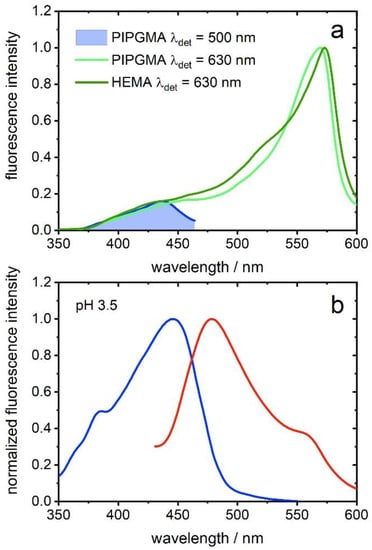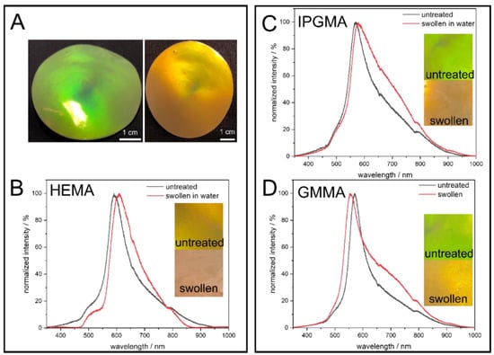 28]. In contrast, opal films comprising HEMA excited with 500 nm show an emission maximum at 581–595 nm, which is expected for the deprotonated form (RO
