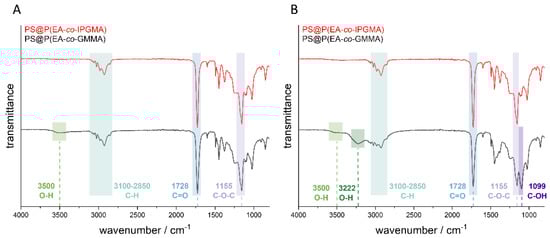 co-BDDA)) core particles using a batch process, followed by the continuous addition of either S and BDDA, in a starved-feed mode. Thereby, the average diameter of the core particles was adjusted to be 203.2 ± 7.8 nm (according to dynamic light scattering (DLS) data). Using BDDA as the cross-linker reagent offers the possibility to reinitiate the polymerization via free vinylic moieties on the core particle surface. Thus, the cross-linked interlayer containing methyl methacrylate (MMA) and allyl methacrylate (ALMA) was introduced. Based on the two different reactive sites of ALMA, subsequent anchoring of the soft polymer shell material was possible. In this regard, it is well known from the literature that covalent grafting of the shell material, provided by an interlayer, is mandatory to prevent the detachment of the polymer chains and, simultaneously, ensure the particles’ stability [