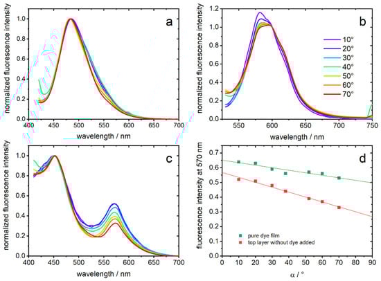 Fluorescent spectra were measured with a JASCO FP 6500 spectrofluorometer (JASCO incorporated, Easton, MD, USA) and a custom-made sample holder for the films. The sample holder allowed to adjust the angle α between film surface and detection pathway between 10° and 70°. If not mentioned otherwise, a top layer without dye was added to the actual film. Microscope cover slips of 170-μm thickness were used as carrier material of the films. Spectra were normalized to the fluorescence maximum of one of the emissive species or shown angles to cope with the varying excitation intensities and for the sake of a better comparability.