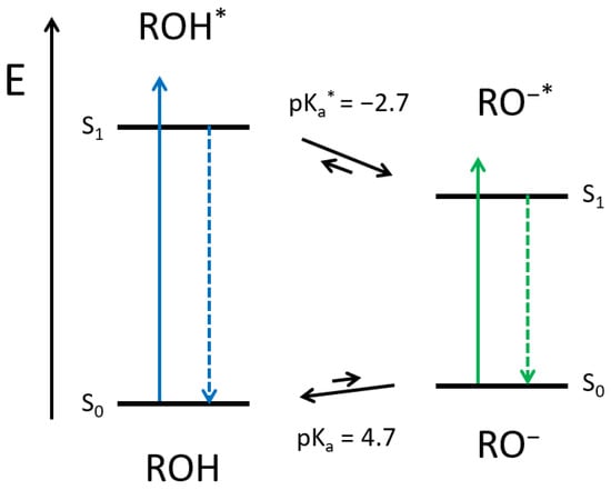 Here, photoacids are fluorophores, which become much more acidic upon electronic excitation. The peculiarity of photoacids compared to other strongly emissive molecules is that a photochemical reaction, i.e., the excited-state proton transfer (ESPT), competes with the radiative decay. Therefore, if the neutral form of the photoacid (ROH) is excited, and a suitable proton acceptor is available, the deprotonated species of the photoacid (RO