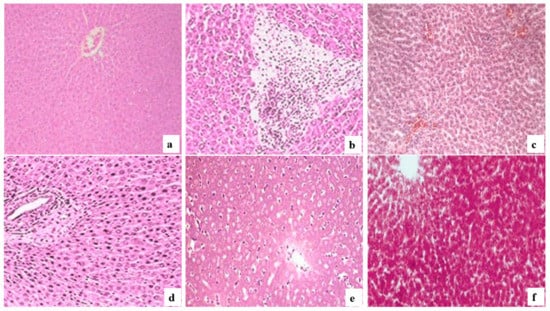 Photomicrographs of Architecture of hepatic cells during Hepatoprotective activity. (a) Photomicrograph of Liver section from Control group (LP only) rats showing normal hepatic architecture. (b) Photomicrograph of Liver section from Carbon tetrachloride treated rats showing severe hepatotoxicity. (c) Photomicrograph of Liver section from Silymarin treated rats showing almost normal architecture. (d) Photomicrograph of Liver section from DCME (200 mg/kg) treated rats showing almost normal architecture. (e) Photomicrograph of Liver section from EE (100 mg/kg) treated rats showing almost normal architecture. (f) Photomicrograph of Liver section from CE (50 mg/kg) treated rats showing almost normal architecture.