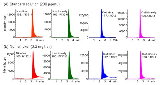 Typical MRM chromatograms obtained from (A) standard solution and (B) hair sample of non-smoker by in-tube SPME LC−MS/MS. Analytical conditions are described in the Experimental section.