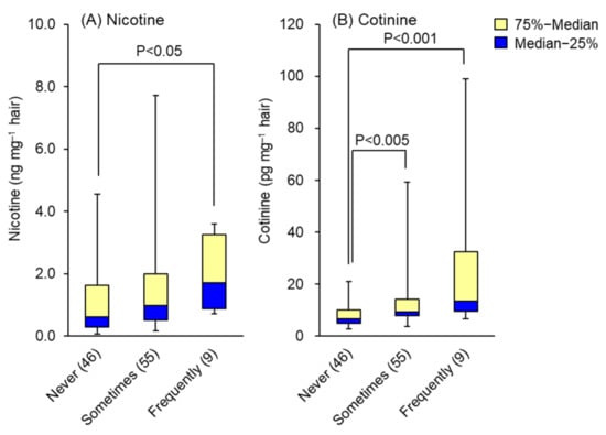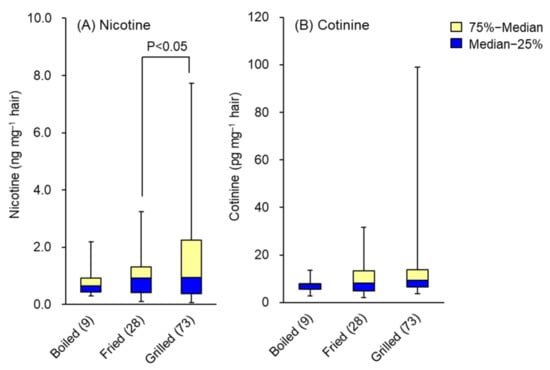 There were no significant differences in hair nicotine and cotinine levels between frequencies of food intake, but those who consumed more spices tended to have lower levels. On the other hand, there were no significant differences in hair nicotine and cotinine levels depending on the frequency of meat consumption, but these levels tended to increase in those who ate grilled meat more often. Hair nicotine contents by consumption of boiled (9), fried (28) and grilled (73) meat were 0.81 ± 0.59, 1.02 ± 0.80 and 1.59 ± 1.55 ng mg−1, and hair cotinine contents were 8.6 ± 2.7, 9.6 ± 6.3 and 19.1 ± 20.5 pg mg−1, respectively. Whisker-box plots of medians and interquartile ranges of hair nicotine and cotinine are shown in Figure 3A,B. These results may be affected by the tobacco smoke environment in places where grilled meat is eaten, such as grilled meat restaurants, since there was almost no effect of nicotine and cotinine from smoke other than tobacco smoke, such as smoke generated by cooking.