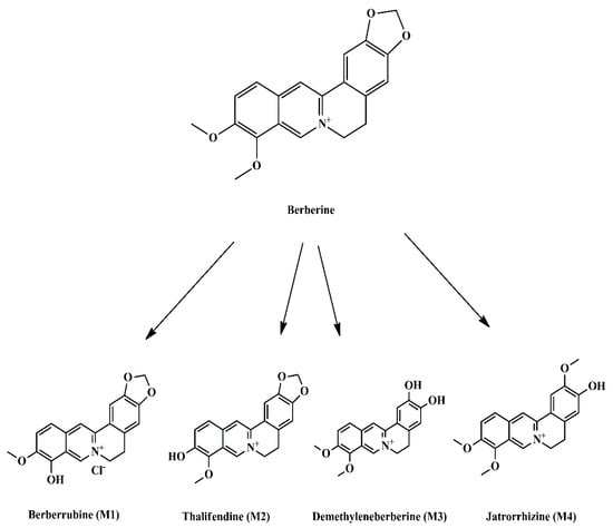 In humans and mice, the primary metabolites of BBR are berberrubin (M1), thalifendine (M2), demethyleneberberine (M3), and jatrorrhizine (M4), as other alkaloids contained in the extracts of H. candidiasis (such as hydrastine) (Figure 1) [35,36]. The bacterial microflora of the intestine plays an important role in the enterohepatic circulation of BBR and its regulated metabolites. Recent reports have shown that the microbiota of a healthy intestinal tract helps convert berberine to its easily absorbable form, dihydroberberine, which displays a 5-fold higher intestinal absorption rate compared with its parent molecule [36]. Following administration of BBR in rats and humans, the presence of the BBR metabolites M1, M2, M3, and M4 was detected in bile, urine, and feces, as well as BBR sulfate and glucuronide conjugates [37]. The pharmacokinetic profile of BBR and its metabolites, which was extensively studied both in animal models [38] and in humans [39], demonstrated analogies between the two models, mainly regarding the low oral bioavailability of BBR, thus requiring relatively high dosages for clinical practice (0.5–1 g/month). Chen et al. studied the BBR pharmacokinetic profile in rabbits after intravenous administration of 2 mg/kg BBR sulfate, obtaining the following kinetic parameters; t1/2(α): 2.32 ± 1.18 min, t1/2(β): 5.28 ± 1.00 h, total plasma clearance (CL): 5.46 ± 1.62 L/h, elimination rate constant (K10): 1.75 ± 1.17 h−1, and an area under the concentration-time curve (AUC): 0.84 ± 0.27 μg h/mL [40].