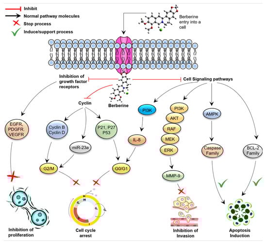 BBR reduced the expression of the proliferating cell nuclear antigen (PCNA) protein and cyclin D1 in MDA-MB-468 cell cultures to block their progression into the G1 phase of the cell cycle. Likewise, application of BBR to MDA-MB-468 cells at a dose of 6 and 12 μM for 48 h caused a cell cycle arrest in the first growth (G1) phase with a decrease in the expression of cyclin D1 depending on the dose [46]. Zhao and Zhang recently investigated the role of berberine regarding the behavior of the MDA-MB-231 malignant breast tumor cell line. Namely, BBR reduced cell migration ability, provoked inhibition of phosphorylation, decreased overexpression of the tumor necrosis factor α (TNF-α) and Interleukin 6 (IL-6), and induced suppression of the nuclear factor kappa light chain enhancer of activated β cells (NF-Κβ) [47].