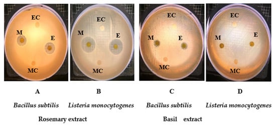 An agar diffusion assay [67] was performed in order to assess the antimicrobial efficiency of the basil and rosemary extracts against the foodborne pathogens listed previously. Active bacterial strains were inoculated in Mueller–Hinton broth (Oxoid, CM0405) at a concentration of 106 CFU/mL and incubated overnight. From this broth, 100 µL was spread-plated onto Mueller–Hinton agar (Oxoid CM 0337). The basil and rosemary extracts were dissolved separately in 96% ethanol and methanol to provide a final concentration of 100 mg/mL and all samples were stored at 4 °C until further analysis. Three sterilized 6 mm Whatman filter paper disks were saturated as follows: the first disc was saturated with 50 µL of methanolic basil extract, while the second disc was saturated with 100 µL of the same substance. For a control, the disc was saturated with only methanol. The same procedure was followed with the methanolic rosemary extract, as well as the ethanolic extracts of both herbs (using ethanol on the control disc instead). The inhibition zone (mm) was determined for each tested pathogen with each extract after incubation at the suitable temperature.