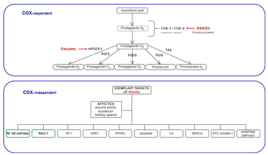 Mechanisms of NSAIDs’ action: COX-dependent and exemplary COX-independent targets relevant for cancer development. The COX-independent targets evaluated in the present study are bolded, and are indicated by a green frame. NSAIDs, non-steroidal anti-inflammatory drugs; COX, cyclooxygenase; mPGES, microsomal prostaglandin E2 synthase; PGFS, prostaglandin F synthase; PGDS, prostaglandin D synthase; PGIS, prostacyclin synthase; TXS, thromboxane synthase; NAG-1, NSAIDs-activated gene; AP-1, activator protein 1; HSPs, heat shock proteins; PPARs, peroxisome proliferator-activated receptor; CA, carbonic anhydrase; SERCA, sarco (endo)-plasmic calcium ATPase; ETC, electron transport chain.