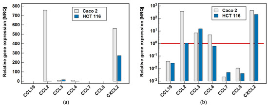Relative expression of MCPs and MIPs in the Caco-2 and HCT 116 colonic adenocarcinoma cell lines: (a) non-logarithmized data; (b) data presented on a log-scale. The data are presented as normalized relative quantities (NRQ), normalized against GAPDH expression and expressed in relation to the geometric mean of global expression of all of the genes across both cell lines. The gene expression was analyzed in the control (untreated) cells, n = 9 per line. The red horizontal line represents the global mean expression.