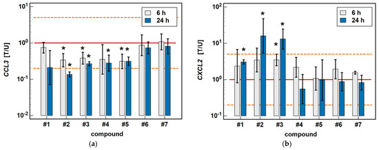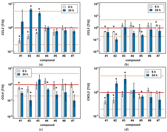 Time-dependent effect of oxicams on MCP and MIP expression in Caco-2 cells: (a) CCL2; (b) CCL3; (c) CCL4; (d) CXCL2. The bars and whiskers represent the mean ± SD expression ratio of the normalized relative quantities [NRQ] obtained for cells treated with 200 μM oxicams for 6 and 24 h, and the corresponding untreated controls [T/U]. The significant differences between the treated and untreated cells, analyzed using a t-test for paired samples, are indicated by asterisks (*). The expression ratio of 1 (no change) is indicated by a red solid reference line, while the expression ratio of 5 (5-fold upregulation) and the expression ratio of 0.2 (5-fold downregulation) are indicated by an orange dashed reference line. Compound #6 denotes piroxicam, and #7 denotes meloxicam.