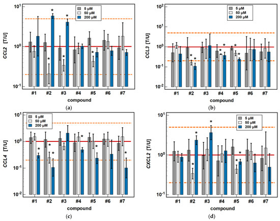 Dose-dependent effect of oxicams on MCP and MIP expression in Caco-2 cells: (a) CCL2; (b) CCL3; (c) CCL4; (d) CXCL2. The bars and whiskers represent the mean ± SD expression ratio of the normalized relative quantities [NRQ] obtained for cells treated with 5, 50, and 200 μM oxicams for 24 h, and the corresponding untreated controls [T/U]. The significant differences between the treated and untreated cells, analyzed using a t-test for paired samples, are indicated by asterisks (*). An expression ratio of 1 (no change) is indicated by a red solid reference line, while an expression ratio of 5 (5-fold upregulation) and an expression ratio of 0.2 (5-fold downregulation) are indicated by an orange dashed reference line. Compound #6 denotes piroxicam, and #7 denotes meloxicam.