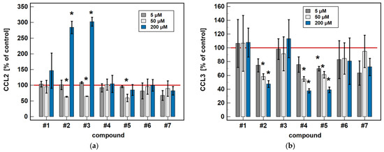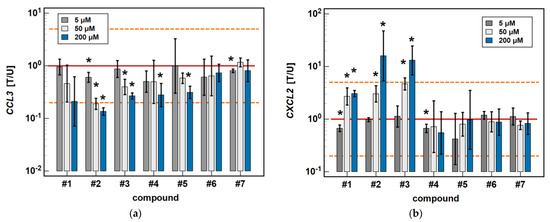 As for the 6-h cultures treated with 200 μM, a lower dose (50 μM) of compounds #2 (4.8-fold) and #3 (2.9-fold) inhibited CCL2 expression, and compound #2 inhibited CXCL2 (2.9-fold), while treatment with 200 μM concentrations had the opposite effect (Figure 5).