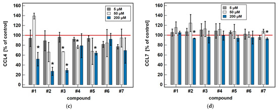 In Caco-2 cells, compounds #2, #4 and #5 dose-dependently downregulated CCL3 and CCL4 expression. The inhibitory effect of the 50 μM concentration was significant for all of these compounds in the case of CCL3 expression (6.2-, 2.3-, and 2.1-fold, respectively), and only for #2 (4-fold) in the case of CCL4 expression (Figure 5).