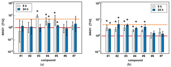 In Caco-2 cells, piroxicam (#6), and meloxicam (#7), as well as compounds #1 and #2, had no significant impact on NAG1 at 6 or 24 h, while compound #3 upregulated the gene expression 9-fold after 6-h treatment without an effect after 24 h. In the case of compounds #4 and #5, the expression of NAG1 was significantly upregulated, more markedly following the 6-h than 24-h treatment (respectively, 3.4- and 2.3-fold for #4, and 4.1- and 1.4-fold for compound #5) (Figure 9).