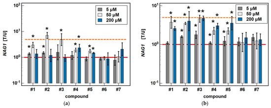 Dose-dependent effect of oxicams on NAG1 expression in (a) Caco-2 cells and (b) HCT 116 cells. The bars and whiskers represent the mean ± SD expression ratio of the normalized relative quantities [NRQ] obtained for cells treated with 5, 50, and 200 μM oxicams for 24 h, and the corresponding untreated controls [T/U]. The significant differences between the treated and untreated cells, analyzed using a t-test for paired samples, are indicated by asterisks (*). An expression ratio of 1 (no change) is indicated by a red solid reference line, while an expression ratio of 5 (5-fold upregulation) and an expression ratio of 0.2 (5-fold downregulation) are indicated by an orange dashed reference line. Compound #6 denotes piroxicam, and #7 denotes meloxicam.