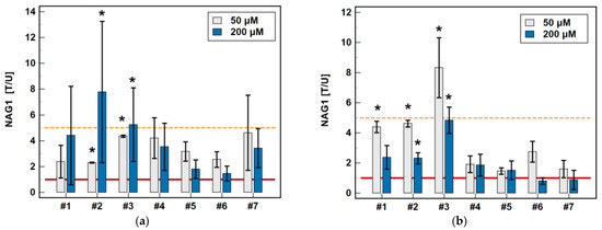 Effect of oxicams on NAG1 protein expression in (a) HCT 116 cells and (b) HT-29 cells. The bars represent the mean ± SD (whiskers) of the expression ratio between cells treated with 50 or 200 μM oxicams for 48 h, and the corresponding untreated controls [T/U]. The significant differences between the expressions in the treated and untreated cells, analyzed using a t-test for one mean, are indicated by asterisks (*). An expression ratio of 1 (no change) is indicated by a red solid reference line, and an expression ratio of 5 (upregulation) is indicated by an orange dashed reference line. Compound #6 denotes piroxicam, and #7 denotes meloxicam.