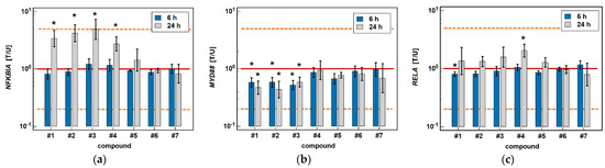 Effect of oxicams on the expression of NFκB-associated genes in Caco-2 cells: (a) NFKB1A; (b) MYD88; (c) RELA. The bars and whiskers represent the mean ± SD expression ratio of the normalized relative quantities [NRQ] obtained for cells treated with 200 μM oxicams for 6 and 24 h, and the corresponding untreated controls [T/U]. The significant differences between the treated and untreated cells, analyzed using a t-test for paired samples, are indicated by asterisks (*). An expression ratio of 1 (no change) is indicated by a red solid reference line, while an expression ratio of 5 (5-fold upregulation) and an expression ratio of 0.2 (5-fold downregulation) are indicated by an orange dashed reference line. Compound #6 denotes piroxicam, and #7 denotes meloxicam.
