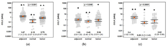 An expression of MCP chemokines in tumor and tumor-adjacent tissue compared to normal mucosa from non-cancer patients: (a) CCL2; (b) CCL7; (c) CCL8. The data are presented as means (CCL2) or medians (CCL7 and CCL8) with 95% confidence intervals. The data were analyzed using one-way ANOVA with a Student-Newman-Keuls post hoc test or a Kruskal–Wallis H test with a Conover post hoc test, respectively. The significant between-group differences are indicated by the same type of symbol: *, +, or ^. NRQ, normalized relative quantities.