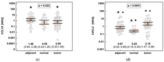 An expression of the MIP chemokines in tumor and tumor-adjacent tissue compared to normal mucosa from non-cancer patients: (a) CCL3; (b) CCL4; (c) CCL19; (d) CXCL2. The data are presented as means (CCL19) or medians (CCL3, CCL4, and CXCL2) with 95% confidence intervals. The data were analyzed using one-way ANOVA with a Student-Newman-Keuls post hoc test or a Kruskal–Wallis H test with a Conover post hoc test, respectively. The significant between-group differences are indicated by the same type of symbol: *, +, or ^. NRQ, normalized relative quantities.