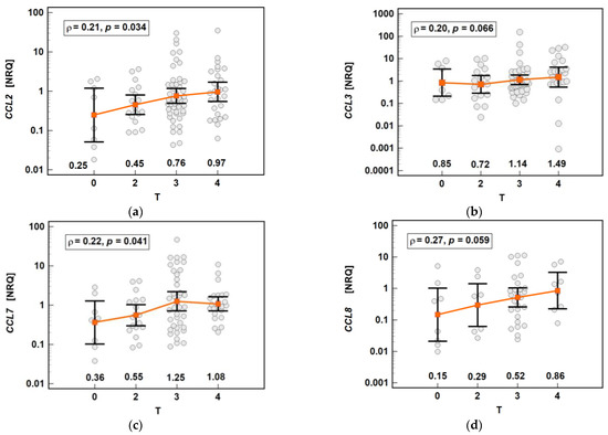 Impact of the depth of tumor invasion on the chemokine expression in tumors: (a) CCL2; (b) CCL3; (c) CCL7; (d) CCL8. The data are presented as means with 95% confidence intervals, and as Spearman correlation coefficients (ρ). NRQ, normalized relative quantities.