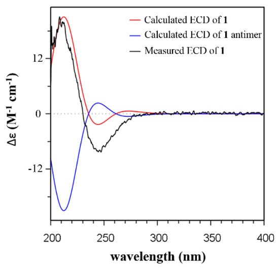Comparison of the experimental ECD spectra of 1 with the TDDFT-predicted ECD curve of 1 (CAM-B3LYP/6-31g(d) functional/basis set, optimization at the B3LYP/6-31g(d) level).