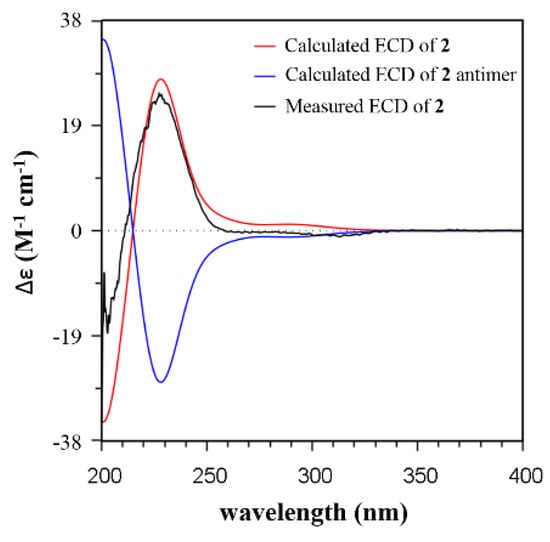Comparison of the experimental ECD spectra of 2 with the TDDFT-predicted ECD curve of 2 (CAM-B3LYP/6-31g(d) functional/basis set, optimization at the B3LYP/6-31g(d) level).