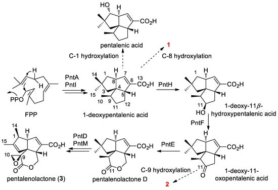 The biosynthetic pathway of pentalennolactone and the assumed production of 1 and 2.