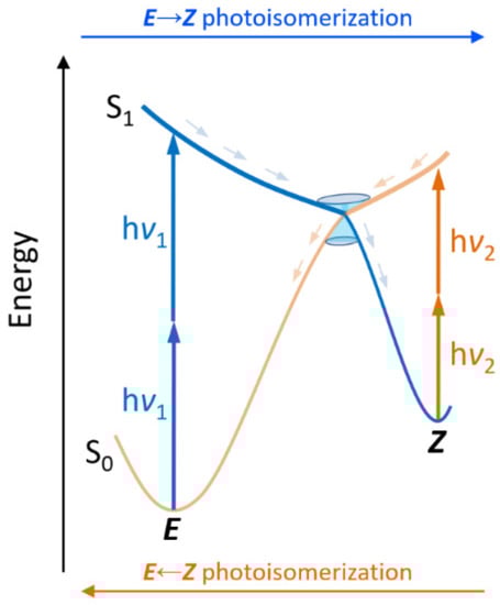 Simplified scheme of a E/Z molecular photoswitch acting by two-photon absorption, including two different frequencies: ν1 for E → Z (blue) and ν2 for E ← Z (orange) photoisomerization. After absorption to the excited state (S1) a conical intersection can ideally funnel the formation of the photoproduct or internal conversion to restore the initial photoisomer.