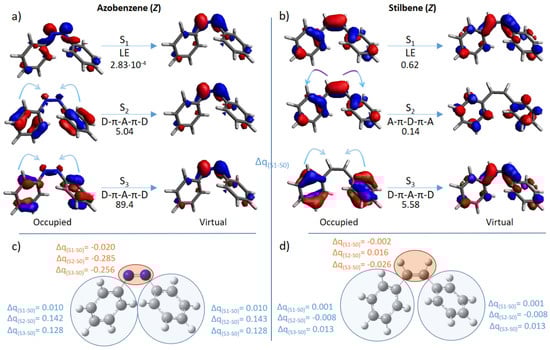 Molecular orbitals mainly involved in the lowest-in-energy optical transitions (S0 → S1,2,3) for the Z form of azobenzene (a) and stilbene (b). The type of electronic transfer (locally excited (LE); from the lateral moieties to the central one (D-π-A-π-D); from the middle moiety to the lateral moieties (A-π-D-π-A) and the σTPA value in GM are given below each arrow. The partial charge transfer (Δq) of groups of atoms (highlighted in light blue and orange) from each excited state to S0, is shown for Z-azobenzene (c) and Z-stilbene (d).