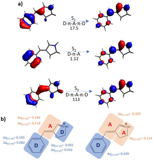 Instead, the protonated Schiff-base like switch shows a completely different behavior (Figure 4): the S1 and S3 states, both of D-π-A-π-D character, are characterized by high TPA cross-sections (17.5 and 113 GM, respectively), while S2 is a D-π-A state presenting a moderate TPA efficiency, 1.12 GM. As already concluded elsewhere [], we could explain the TPA cross-section tendencies in terms of transition moments: since the D-π-A-π-D system is effectively polarized by both parts of the optical field cycle, its transition dipole moment will be larger than the corresponding D-π-A system, since this last is easily polarized in only one direction. Although this simple qualitative consideration can be considered a useful rule of thumb, the related TPA-cross section magnitude will be chromophore dependent. Indeed, in this specific system, due to the positive charge of the Schiff-base mainly located on part of the 5-membered ring, we expect that the two donor groups will not be equivalent, with the phenyl ring acting as a much strongest donor.