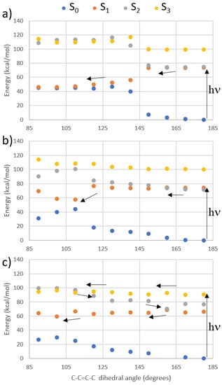 Single State (SS)-CASPT2 photoisomerization pathways when irradiating (a) S1, (b) S2, and (c) S3, shown with arrows.