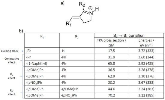 Considering the promising results offered by the retinal-like core, we have accordingly proposed different derivatives for this structure, with the goal of increasing the TPA cross-section values when irradiating to S1, which is the ideal strategy for an absorption red-shifting while maintaining an ultrafast isomerization (Figure 5a). In particular, different R1 and R2 substituents were introduced, while in the parent compound, R1 is a phenyl group, and R2 a hydrogen atom (Figure 6a). One of the keys to understand the following results (Figure 6b) is that R1 constitutes the donor, while R2 participates as acceptor moiety (Figure 4b).