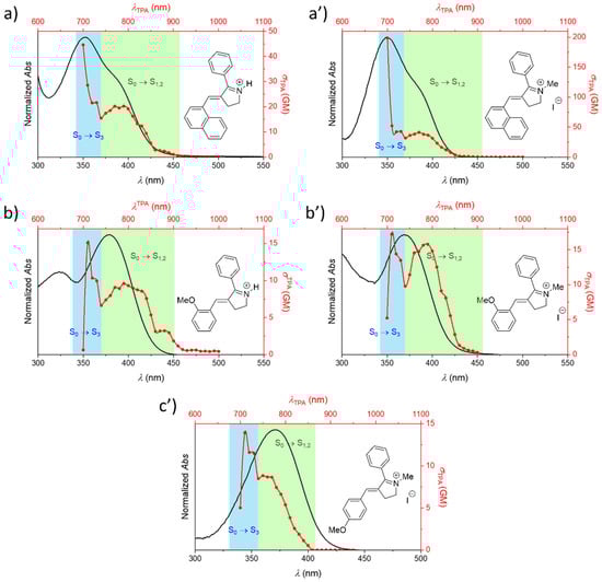 From these results we can conclude that both quaternized forms are expected to affect to a similar extent the optical properties, as described before for rhodopsin-based molecular switches []. However, it should be noted that, as previously stated, the protonation process depends on the pH value, and therefore might not occur in a quantitative fashion, whereas the methylation ensures the experimental characterization of the cationic quaternized photoswitch. Indeed, as it can be seen in Figure 7 (a vs. a’, and b vs. b’), the OPA spectra are almost superimposable in the absorption region of interest, while the TPA spectra are qualitatively similar in shape, with differences that could arise from the fact that the protonated form is in equilibrium with the deprotonated one. That is, both species are contributing to the spectrum up to some extent. This behavior is precisely well illustrated by the 1-Naphthyl derivative, where methylated analogue yields the highest TPA cross section within the examined compounds; this, in turn, reflects an improved π-conjugated system along the backbone. In contrast, and according to what it is anticipated for these quaternized forms, similar TPA properties are determined in the case of –(oOMe)Ph derivatives. Based on this reasoning, we decided to investigate only the properties of the methylated –(pOMe)Ph analogue. When comparing the TPA properties of the methylated analogues of these positional isomers (Figure 7b’,c’), it can be further confirmed that the position of the methoxy donor group within the scaffold has minimum influence on the optical properties, i.e., the values determined for these derivatives are very close to each other, ca. 15 GM for both cases (see Table S2).