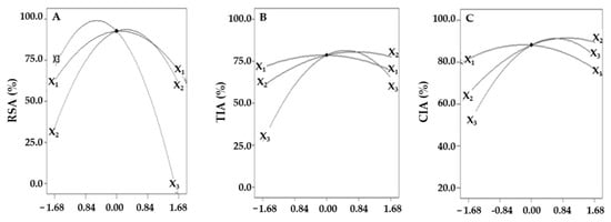 Perturbation plots showing the effects of each of the independent variables on RSA (A), TIA (B), and CIA (C) while fixing other variables at center points. X1 = extraction time (min); X2 = extraction temperature (°C); X3 = ethanol concentration (%).