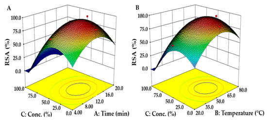 Consequently, the highest value appeared at 14.1 min of extraction time and then decreased; the maximum value was confirmed at 60.7 °C and 46.2% for the extraction temperature and ethanol concentration, respectively. However, when visualizing the rate of change in RSA due to the interactions between variables using the three-dimensional response surface curve, change in extraction time and temperature had little effect on RSA, whereas the ethanol concentration had a significant effect (Figure 2A,B).