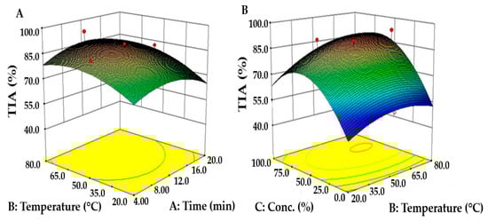 Response surface plots showing the interactive effects of (A) extraction time and ethanol concentration, (B) extraction temperature and ethanol concentration on TIA of S. thunbergii extract. The third variable was fixed at the central point of the CCD.