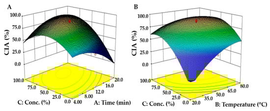 When we measured the CIA under each of 17 conditions, we found that the maximum CIA value was 92.3% at 16.0 min, 63.0 °C, and 80.0% and the minimum CIA was 48.1% at 12.0 min, 51.0 °C, and 0.0% of extraction time, extraction temperature, and ethanol concentration, respectively (Table 2). The quadratic regression equation generated according to extraction time, temperature, and ethanol concentration had an R2 of 0.9237, implying that the sample variation of 92.37% was attributed to the independent variables, and only 7.63% of the total variations could not be explained by the model (Table 3). This indicates a good degree of correlation between the predicted and experimental values of the CIA and recognizes its suitability in predicting the experimental model []. ANOVA demonstrated statistical significance (p = 0.0037) below a significance level of 1% and confirmed that the extraction temperature (p = 0.0030) and ethanol concentration (p = 0.0006) among the linear terms were independent variables that significantly affected CIA (Table 4).