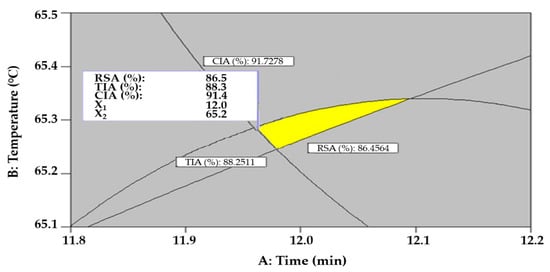 To identify the optimal UAE condition for the extraction of skin-whitening and anti-wrinkle bioactive compounds from S. thunbergii extract, we obtained an optimal point for maximizing the dependent variables by overlapping the individual response surfaces of RSA, TIA, and CIA (Figure 5).
