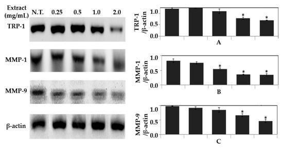 RT-PCR analysis for TRP-1 (A), MMP-1 (B), and MMP-9 (C), and β-actin expression. B16-F0 cells were treated with various concentrations of S. thunbergii extract for 24 h. The statistical analysis of the data was carried out by use of a t-test (* p < 0.05).