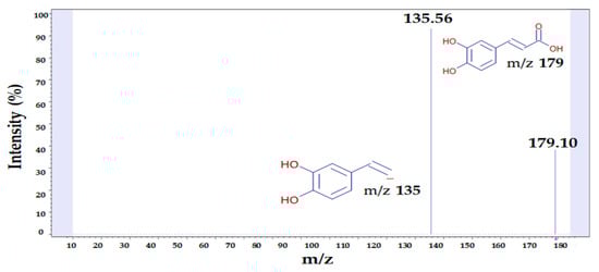 In negative-ion mode, the m/z 179.10 ion, which showed one of the two ion peaks in the mass spectrum, corresponds to the molecular formula of caffeic acid and separated a fragment ion of m/z 135.56. Generally, after collision-induced dissociation, phenolic compounds produce a fragment ion characterized by the loss of CO2 (44 Da) from the carboxylic acid group. Due to this loss, subsequent cleavage of the 44-Da CO2 from the ion at m/z 179.10 gave the ion at m/z 135.56. Caffeic acid is a C6-C3 phenolic compound produced from phenylalanine or tyrosine by plants through the shikimate pathway of secondary metabolism and is a representative of the cinnamic acid (or phenylpropanoid) class. It enters the human diet through several vegetables and fruits []. In recent years, numerous studies have shown that the consumption of caffeic acid has numerous health benefits due to the antioxidant properties that help prevent various diseases associated with oxidative stress []. Thus, this study on phenolic compounds is very useful and may play an important role in the quality control process and future exploration of S. thunbergii as an ingredient with skin-whitening and anti-wrinkling properties.