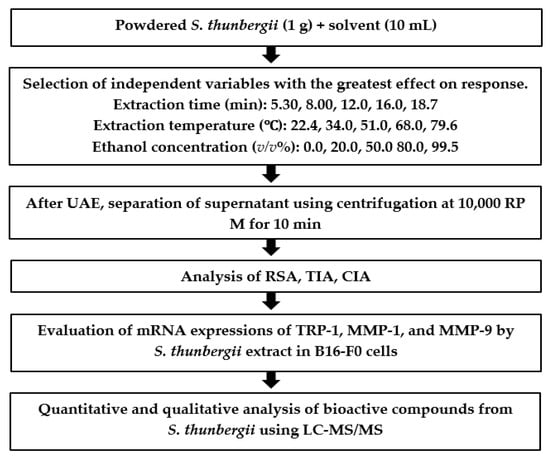 Thus, in this study, we applied UAE to extract bioactive compounds from S. thunbergii and derived the optimal UAE conditions that allow the maximum extraction of antioxidants as well as skin-whitening and anti-wrinkling ingredients using statistically based optimization, and various The inhibitory effects of TRP-1, MMP-1, and MMP-9 gene expression by S. thunbergii extract were evaluated to verify the skin-whitening and anti-wrinkling effects of the derived bioactive compounds and confirm the possibility of utilizing S. thunbergii extract as a functional cosmetic ingredient.