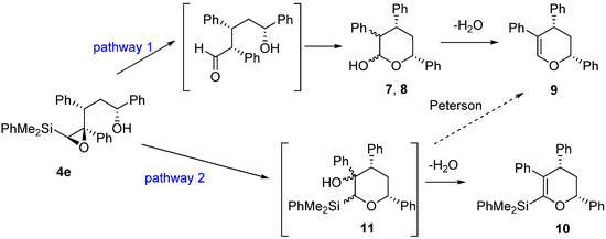 3.2.2. Acid-Catalyzed Intramolecular Cyclization of Epoxysilyl Alcohol 4e