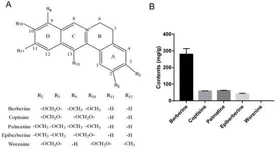 Structures and amount of representative alkaloids, including berberine, coptisine, palmatine, epiberberine, and worenine, in the extracts of Rhizoma Coptidis. (A) Structural formulae of alkaloids. (B) Contents of representative alkaloids, Data are given as the mean ± SD (n = 3).