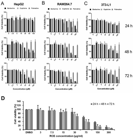 In addition, disparate susceptibility to alkaloids was noted among the three cell lines. Taking the results at 72 h, for example, the IC50 values of coptisine in HepG2 cells, RAW264.7 cells, and 3T3-L1 cells were 18.1 μM, 10.29 μM, and 50.63 μM, respectively (Table 1). Therefore, we concluded that RAW264.7 cells were more sensitive to alkaloids than HepG2 and 3T3-L1 cells.