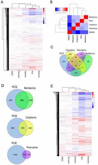 Transcriptome analysis of RCE-, berberine-, coptisine-, and palmatine-treated RAW264.7 macrophages. (A) Clustering analysis of all expressed genes in all samples. (B) The correlation analysis of gene expression in RCE-, berberine-, coptisine-, palmatine- and DMSO-treated samples. The color indicates the correlation coefficient (blue: low, red: high). (C) Venn diagram of differentially expressed genes (DEGs) among RCE-, berberine-, coptisine-, and palmatine-treated RAW264.7 cells. (D) Venn diagram of DEGs of RCE vs. berberine, RCR vs. coptisine, and RCE vs. palmatine. (E) Hierarchical clustering analysis of DEGs with fold change ≥ 2 in each sample. The color of each spot in the heatmap corresponds to the log 2 transformed fold change vs. the PBS of each gene in four samples, with a gradient of color from blue (low) to red (high).