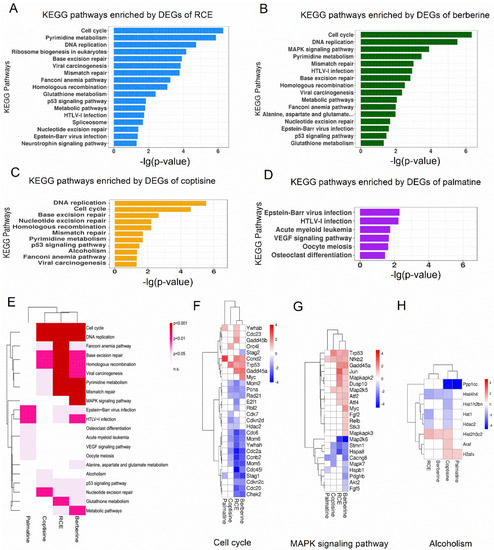 Pathway enrichment analysis of RCE-, berberine-, coptisine-, and palmatine-treated RAW264.7 macrophages. (A) Significantly enriched KEGG pathways for DEGs of RCE, (B) berberine, (C) coptisine, and (D) palmatine (p < 0.05). (E) Clustering analysis of the KEGG pathways enriched by DEGs of RCE, berberine, coptisine, and palmatine. The color indicates the p-value. The redder the color, the smaller the p-value. Heatmap of differential expression of genes implicated in (F) the cell cycle, (G) MAPK signaling pathway, and (H) alcoholism. The color of each spot in the heatmap corresponds to the log 2 transformed fold change vs. DMSO of each gene in four samples, with a gradient of color from blue (low) to red (high).